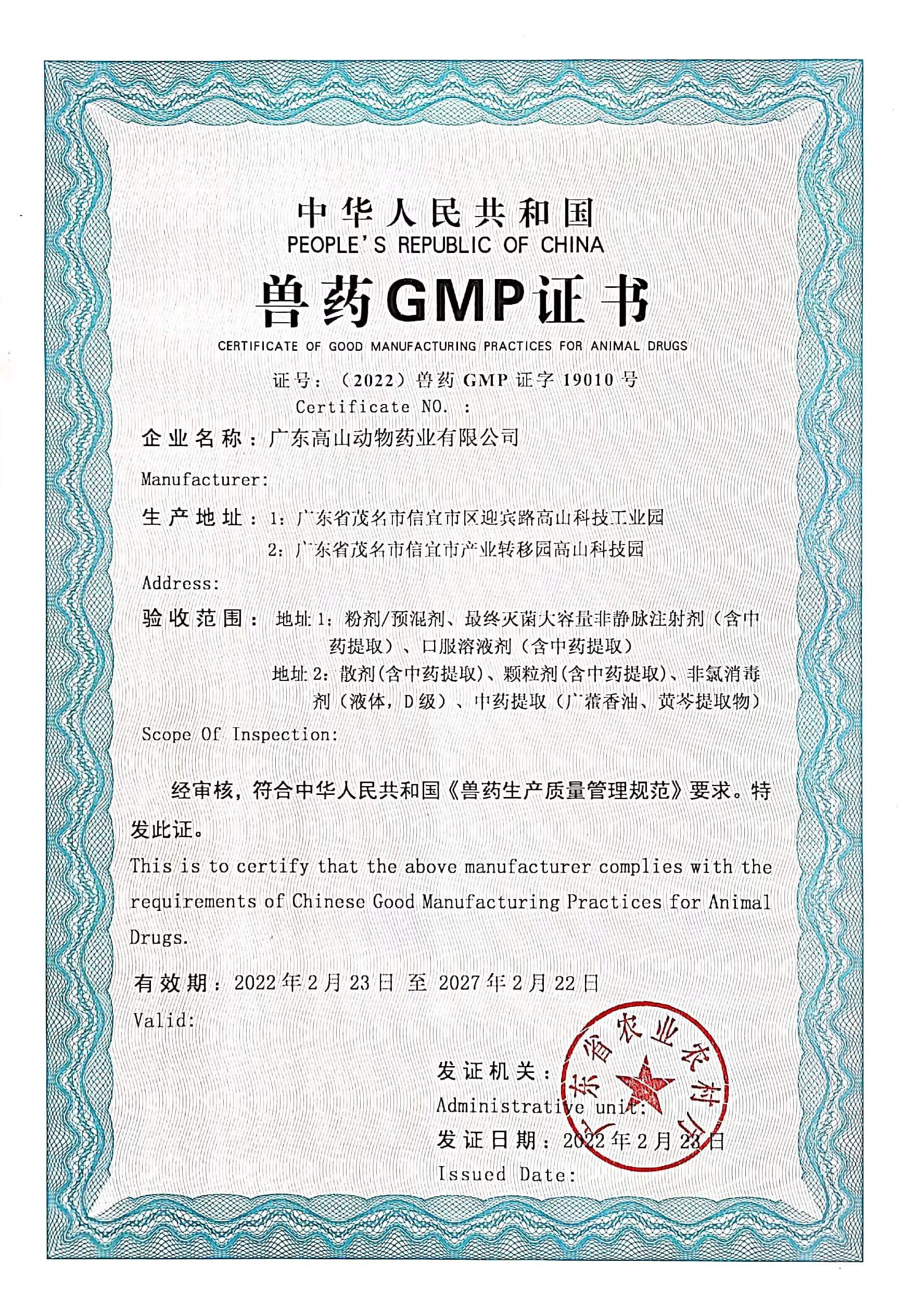 一、高山于2022年1月6日通過最新版國家獸藥GMP驗收;金方子于2022年7月29日通過五年換證驗收。