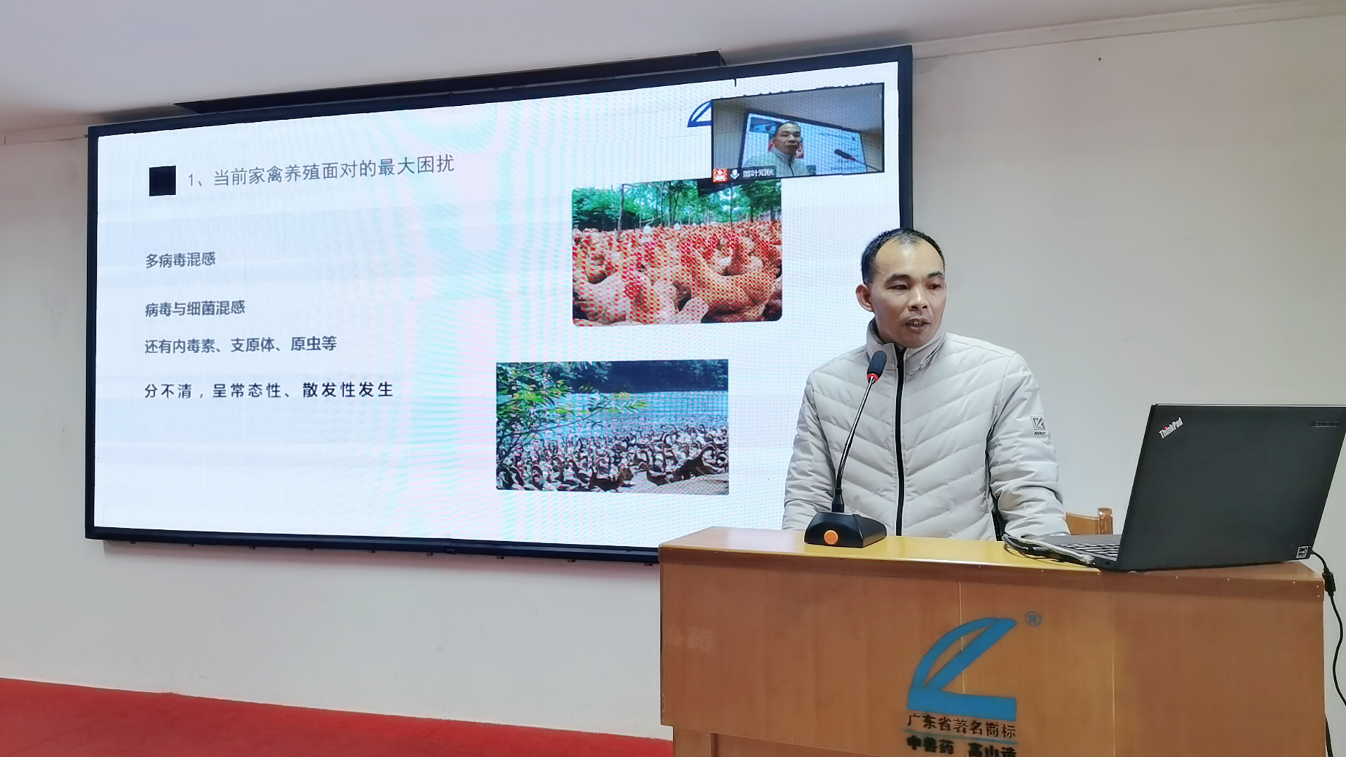 廣東省水禽產(chǎn)業(yè)技術(shù)體系崗位專家、廣東省農(nóng)村科技特派員、廣東海洋大學(xué)濱海農(nóng)業(yè)學(xué)院動(dòng)物科學(xué)系賈汝敏教授通過(guò)視頻會(huì)議作《蛋鴨標(biāo)準(zhǔn)化養(yǎng)殖技術(shù)》報(bào)告,首先詳細(xì)介紹我國(guó)蛋鴨產(chǎn)業(yè)現(xiàn)狀和蛋鴨的品種,深刻剖析蛋鴨的標(biāo)準(zhǔn)化養(yǎng)殖技術(shù),同時(shí)指出蛋鴨養(yǎng)殖面臨的主要問(wèn)題及原因是產(chǎn)蛋量不高、平均體重不夠、整齊度不好、產(chǎn)蛋高峰期短、發(fā)病多發(fā)病急、蛋鴨淘汰早和鴨不掙錢(qián),最后分享了蛋鴨高產(chǎn)穩(wěn)產(chǎn)的關(guān)鍵是全程使用高山中藥無(wú)抗大健康養(yǎng)殖預(yù)防保健方案。