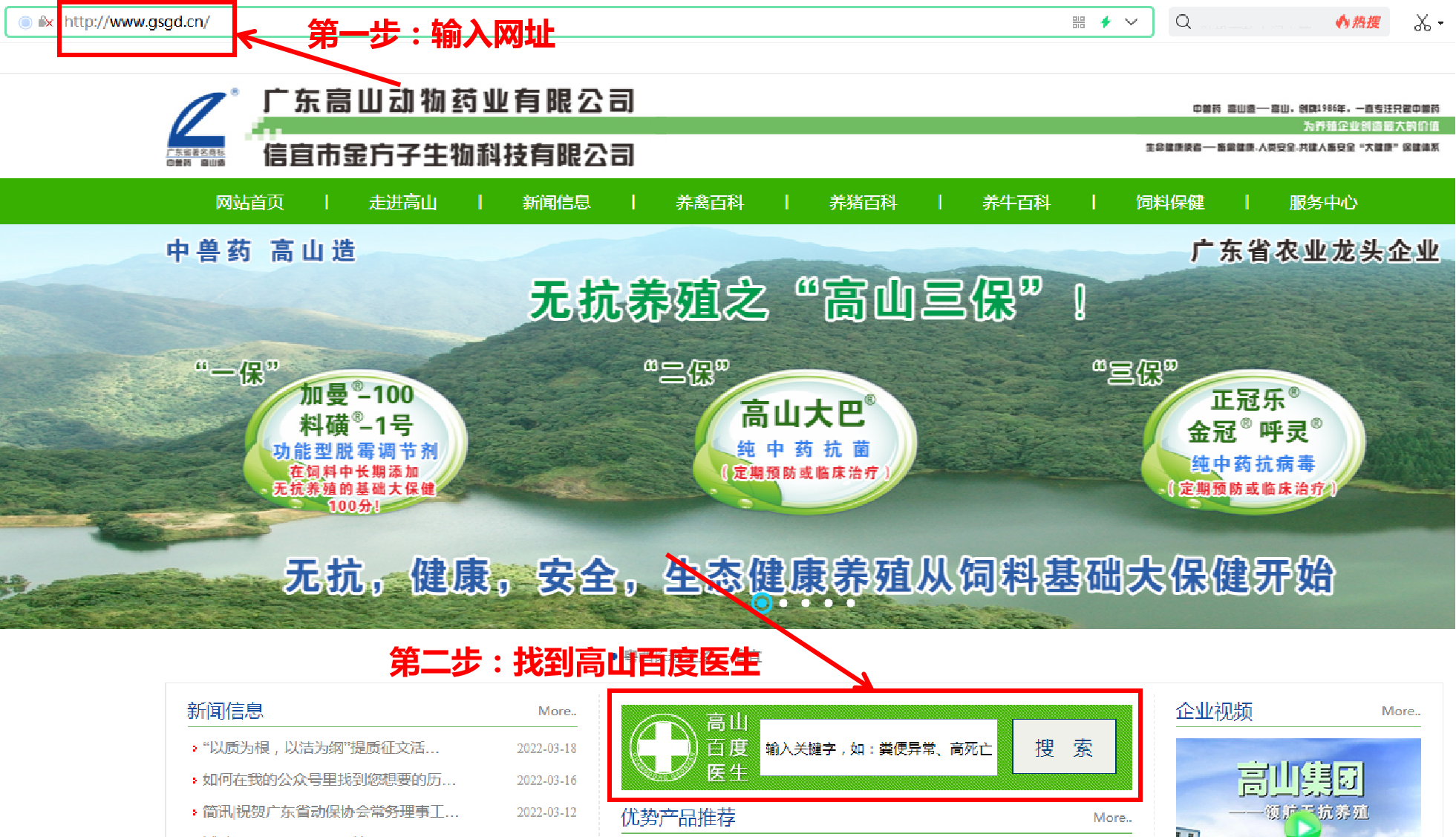第一步:打開電腦瀏覽器或手機(jī)瀏覽器,在其搜索欄輸入網(wǎng)址m.c1837.cn搜索到“廣東高山動物藥業(yè)有限公司官網(wǎng)”點(diǎn)擊進(jìn)入網(wǎng)站找到“高山百度醫(yī)生”,操作步驟(見圖一):