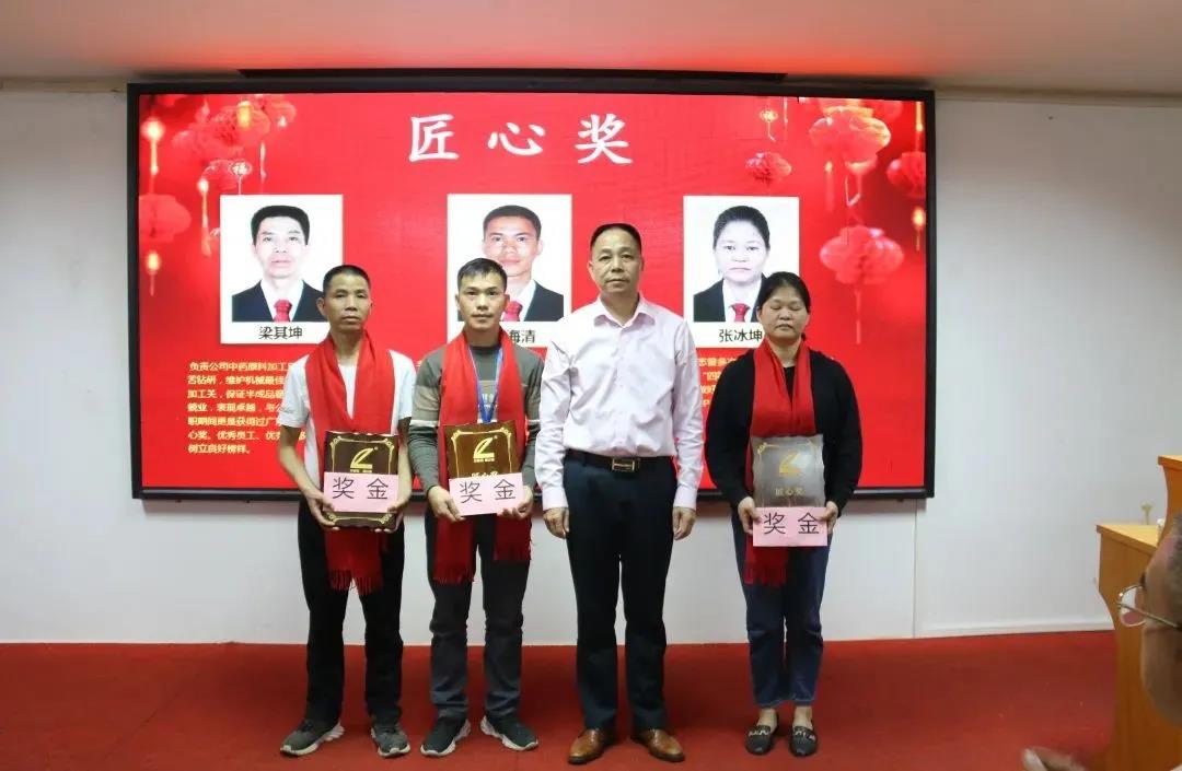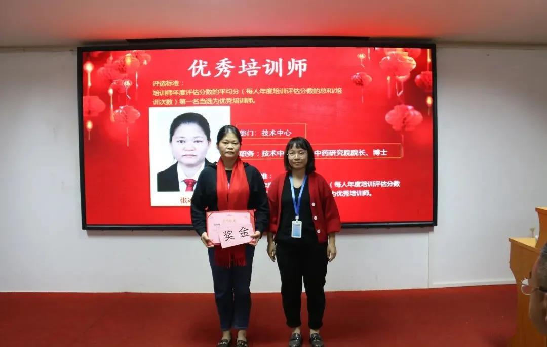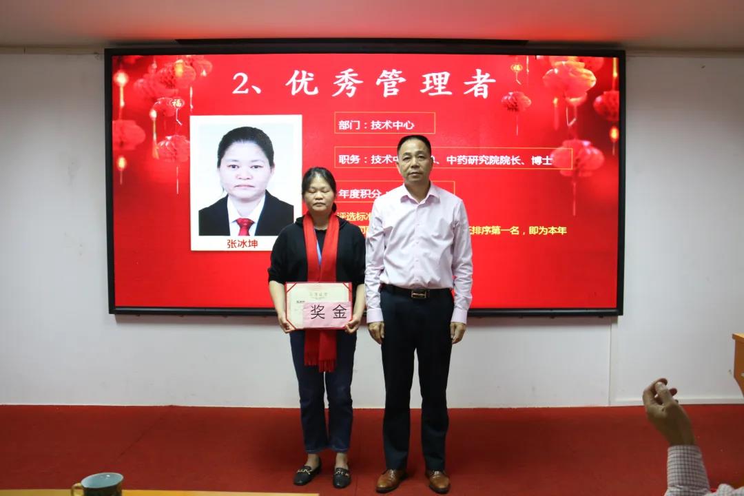 高山集團(tuán)副總經(jīng)理、東東蛋業(yè)總經(jīng)理黎來(lái)鳳為技術(shù)中心和中藥散劑車間頒發(fā)“優(yōu)秀團(tuán)隊(duì)”獎(jiǎng)