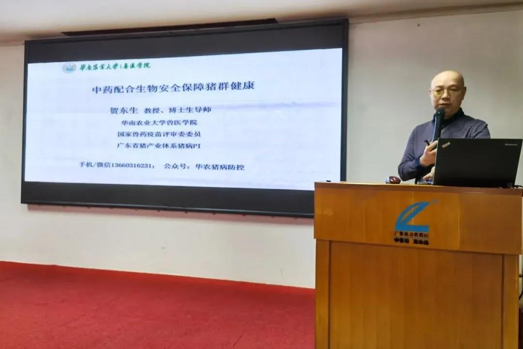 華南農(nóng)業(yè)大學(xué)獸醫(yī)學(xué)院教授、博士生導(dǎo)師、國(guó)家農(nóng)業(yè)部獸藥疫苗評(píng)審委員會(huì)委員、生豬產(chǎn)業(yè)體系豬病崗位科學(xué)家賀東生教授作《中藥配合生物安全保障豬群健康》報(bào)告,首先介紹了什么是生物安全,同時(shí)講解了豬場(chǎng)要做好生物安全的重要性,最后指出可以使用中藥輔助,一是在平常使用可以調(diào)理正氣,恢復(fù)三體平衡,提高抗體水平和抗病力;增強(qiáng)豬群健康度和生產(chǎn)性能;提高肥豬生長(zhǎng)速度,飼料轉(zhuǎn)化率;促進(jìn)采食量和提升肉質(zhì)。二是在關(guān)鍵和轉(zhuǎn)變階段使用,例如在斷奶、轉(zhuǎn)保、產(chǎn)后等,可以減少應(yīng)激和亞健康,緩解腸道和呼吸道疾病。
