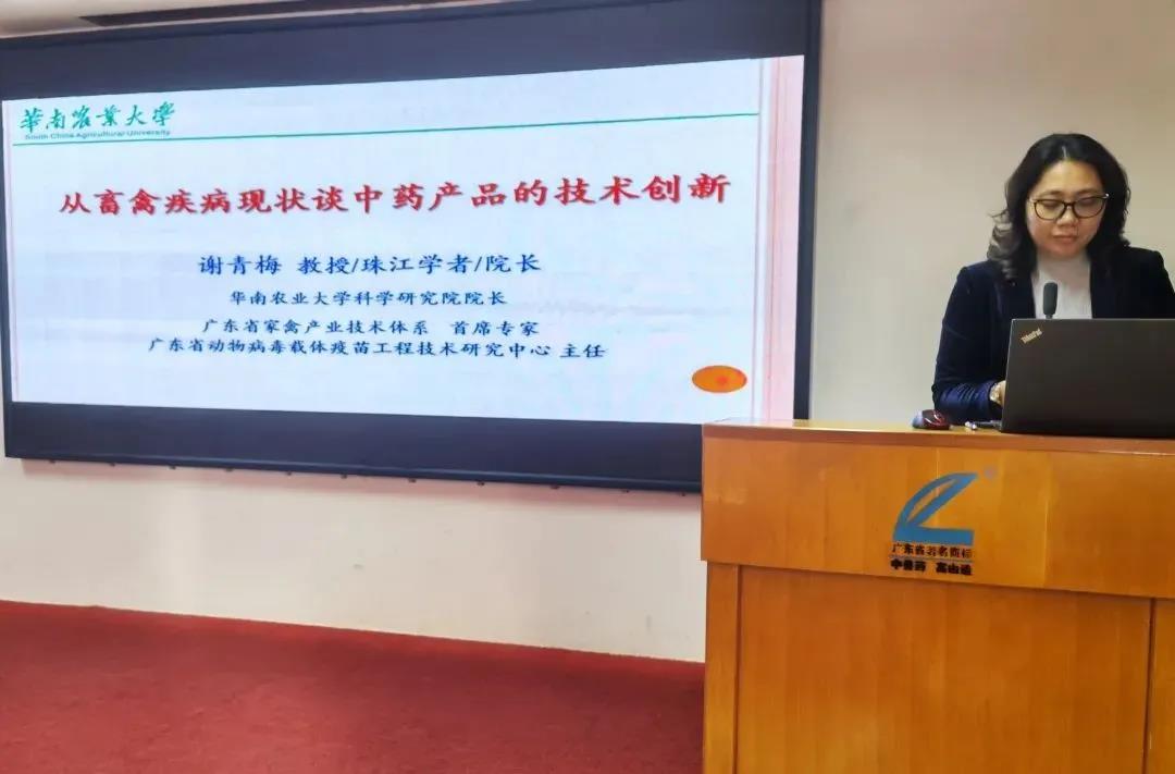 華南農(nóng)業(yè)大學(xué)科學(xué)研究院院長(zhǎng)、教授、博士生導(dǎo)師、廣東省高等學(xué)?!爸榻瓕W(xué)者”特聘教授、廣東省家禽產(chǎn)業(yè)技術(shù)體系首席專家、廣東省畜禽健康養(yǎng)殖與環(huán)境控制企業(yè)重點(diǎn)實(shí)驗(yàn)室副主任、中國(guó)畜牧獸醫(yī)學(xué)會(huì)動(dòng)物微生態(tài)學(xué)分會(huì)常務(wù)理事謝青梅教授作《從畜禽疾病現(xiàn)狀談中藥產(chǎn)品的技術(shù)創(chuàng)新》報(bào)告,首先對(duì)當(dāng)前畜禽疫病流行現(xiàn)狀作了詳細(xì)的闡述,深刻剖析了中藥抗病毒機(jī)制及技術(shù)創(chuàng)新,同時(shí)指出了中藥對(duì)常見病毒性和細(xì)菌性疾病的防治效果非常顯著。