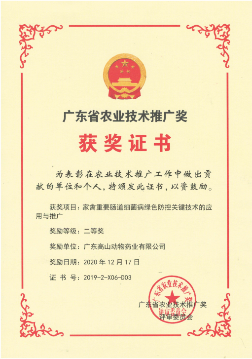 熱烈祝賀廣東高山動(dòng)物藥業(yè)有限公司的“家禽重要腸道細(xì)菌病綠色防控關(guān)鍵技術(shù)的應(yīng)用與推廣”項(xiàng)目榮獲2020度廣東省農(nóng)業(yè)技術(shù)推廣項(xiàng)目二等獎(jiǎng),并于近日獲得廣東省農(nóng)業(yè)農(nóng)村廳頒發(fā)獲獎(jiǎng)證書。