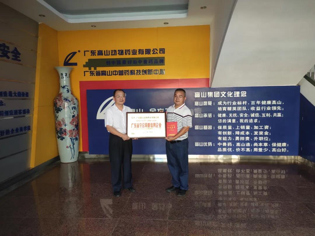 7月6日,信宜市市場(chǎng)監(jiān)督管理局楊業(yè)興副局長等一行到高山進(jìn)行“守合同 重信用”牌匾的授匾儀式。廣東高山動(dòng)物藥業(yè)有限公司連續(xù)第17年被授予“廣東省守合同重信用企業(yè)”榮譽(yù)稱號(hào)。