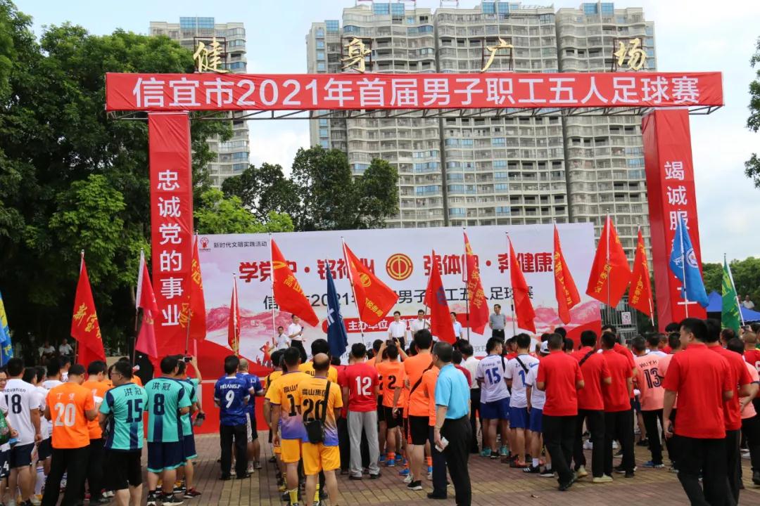 2021年5月17日,信宜市2021年首屆男子職工五人足球賽開(kāi)幕式在市紹秀體育館舉行。高山工會(huì)主席羅銀平領(lǐng)隊(duì),高山工會(huì)盧壽運(yùn)等12名職工代表參加足球賽開(kāi)幕式。本次活動(dòng)的主題是“學(xué)黨史 銘初心 強(qiáng)體魄 奔健康”。
