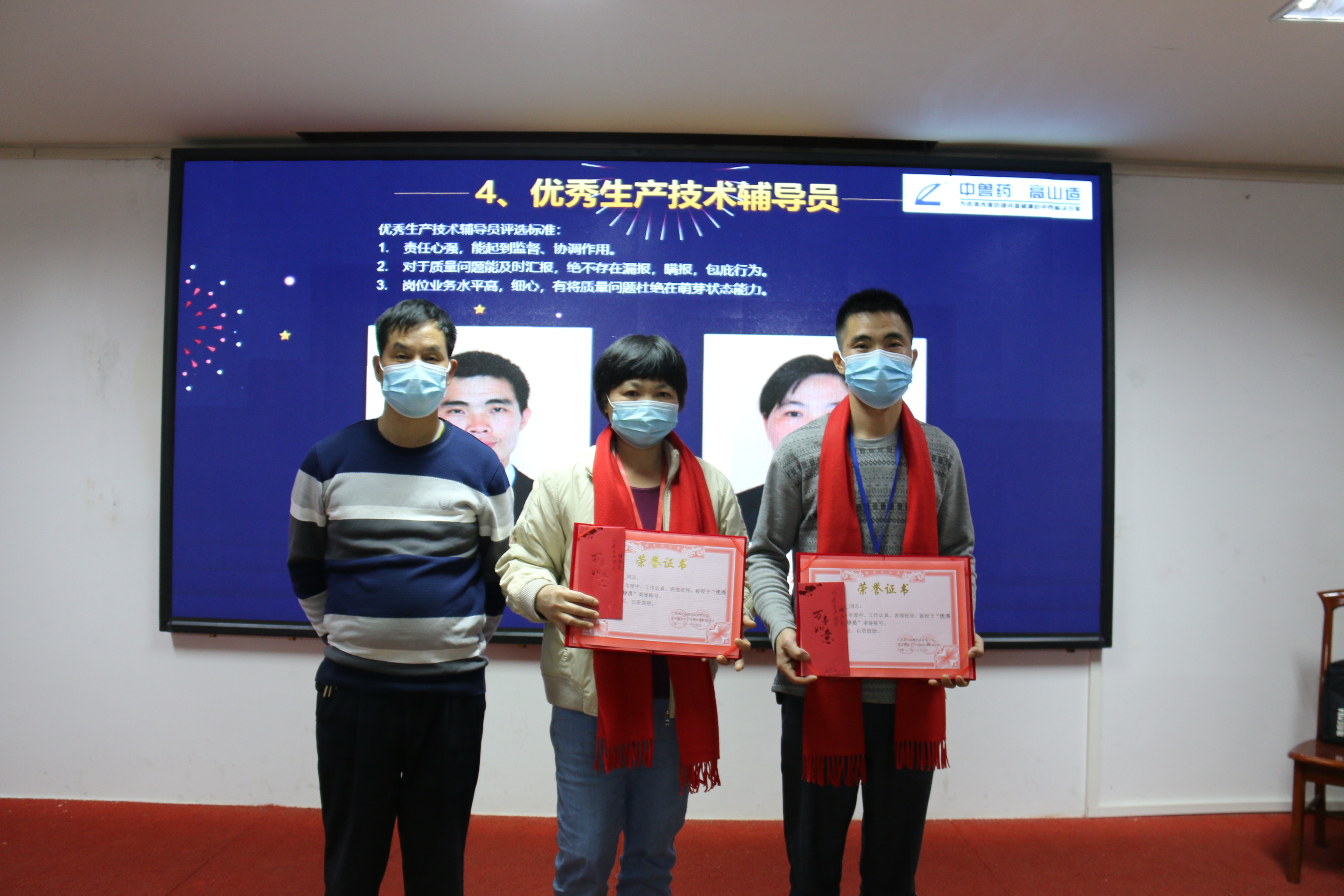 財(cái)務(wù)副總經(jīng)理丘安立為中藥提取車間和中藥原料加工廠頒發(fā)“優(yōu)秀團(tuán)隊(duì)”獎(jiǎng)