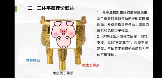 賀教授在國內(nèi)首創(chuàng)動物生命“三體系平衡”理論,且形成了成熟的“三體平衡”理論體系:指豬的生命機體與生命健康是由三大重要的生命平衡體系保障和支撐,即營養(yǎng)體系平衡+微生態(tài)體系平衡+免疫細胞因子體系平衡,它們之間分工協(xié)作、相互支撐,猶如“三足鼎立”。任何一個體系平衡出現(xiàn)問題,都會造成機體器臟功能平衡失調(diào)和健康度下降,導(dǎo)致機體產(chǎn)生亞健康、疾病和死亡。