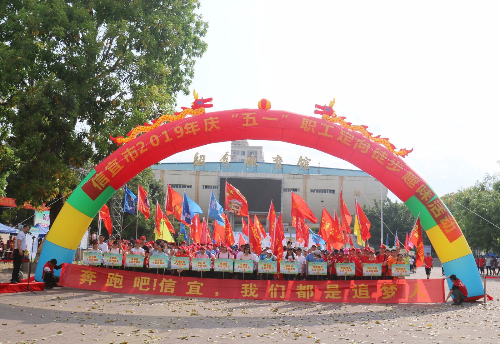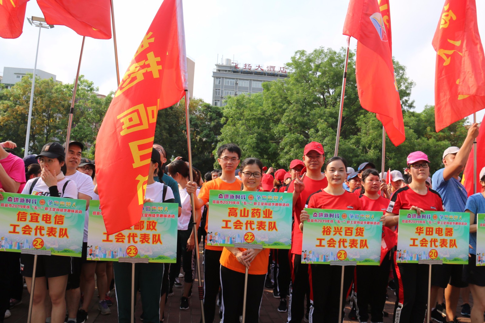 2019年4月23日信宜市紹秀體育中心一片歡聲雷動,熱鬧非凡,值“五一”國際勞動節(jié)來臨之際由信宜市總工會組織市直機關(guān)單位及各基層工會代表開展主題為《奮進新時代·爭做追夢人——凝聚筑夢力量·建設(shè)美麗信宜》信宜市2019年慶“五一”定向徒步趣味活動,全市職工工會代表共62支隊伍1200多人參加活動。高山工會19名職工代表參加了本次活動,活動中高山隊員們精神抖擻,朝氣蓬勃,積極響應(yīng)“奮進新時代,爭做追夢人”精神,展示友愛高山、活力高山、銳軍高山。
