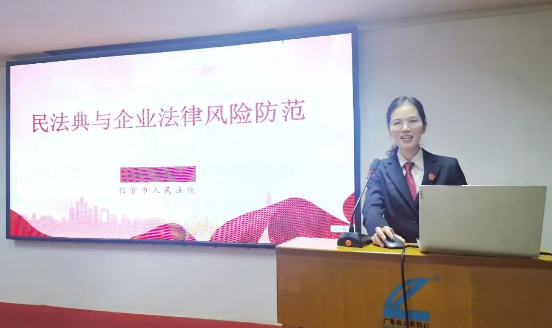 信宜市人民法院民事審判二庭三級法官蔡蕤虹主講《民法典與企業(yè)法律風(fēng)險(xiǎn)防范》,講解了民法典的組成和企業(yè)防范經(jīng)營法律風(fēng)險(xiǎn)的民事法律風(fēng)險(xiǎn),同時(shí)以常見的合同案例作分析,讓大家學(xué)會如何防范相關(guān)的法律風(fēng)險(xiǎn)。