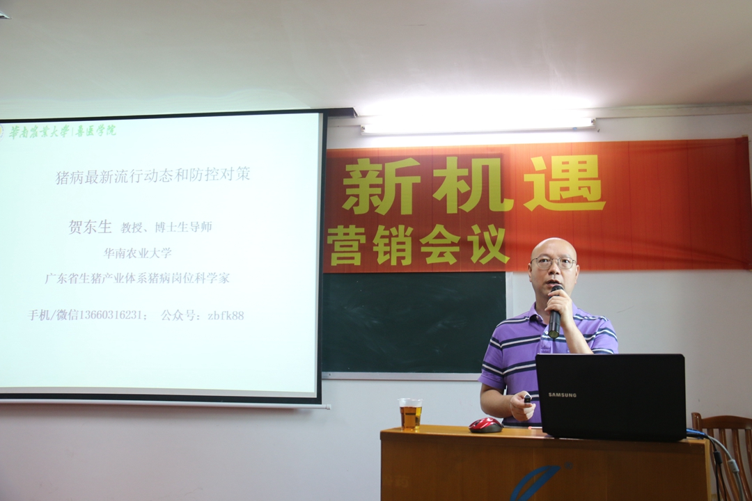 華南農(nóng)業(yè)大學(xué)獸醫(yī)院教授、博士、博士生導(dǎo)師、國家農(nóng)業(yè)部獸藥疫苗評審委員會委員、生豬產(chǎn)業(yè)體系豬病崗位科學(xué)家賀東生作了《豬病最新流行動態(tài)和防控對策》報告。