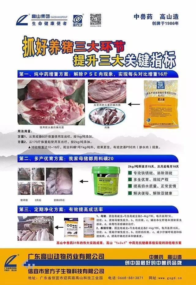 2017年10月30日,第六屆華南(茂名)畜牧博覽會(huì)在化州市康景體育館成功開幕。高山集團(tuán)參展的產(chǎn)品主要有:純中藥增重育肥,解決PSE肉問題的肥大康;所有母豬實(shí)現(xiàn)多生優(yōu)育都可以用的料磺20;定期凈化使用,有效提高成活率的圓藍(lán)粵威龍和弓蟲粵威龍。