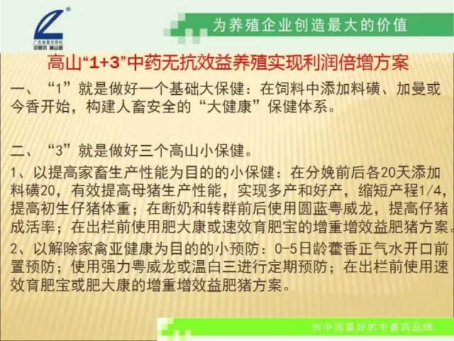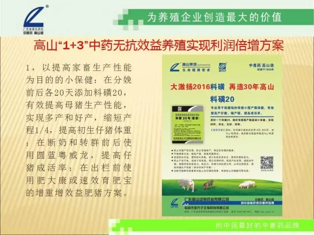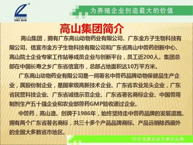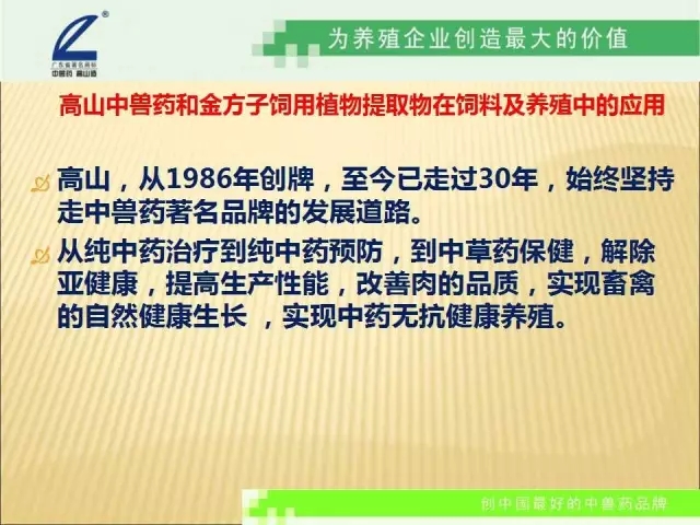 高山,從1986年創(chuàng)牌,走過30年,始終堅(jiān)持走中獸藥著名品牌的發(fā)展道路。從純中藥治療,到純中藥預(yù)防,到中草藥保健,解除畜禽亞健康,提高生產(chǎn)性能,改善肉的品質(zhì),實(shí)現(xiàn)畜禽的自然健康生長 ,實(shí)現(xiàn)中藥無抗健康養(yǎng)殖。