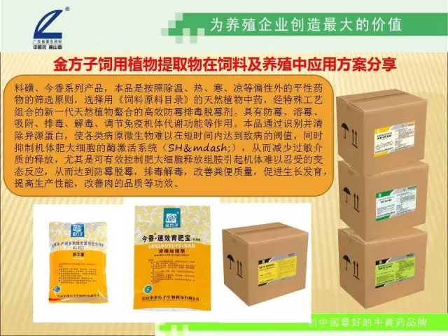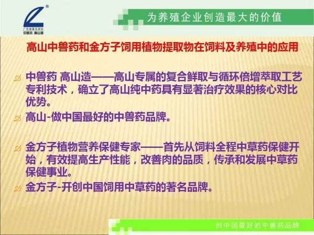 金方子植物營養(yǎng)保健專家。首先從無抗飼料全程中草藥保健開始,有效提高生產(chǎn)性能,改善肉的品質(zhì),傳承和發(fā)展中草藥保健事業(yè)。開創(chuàng)中國飼用中草藥的著名品牌。