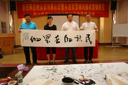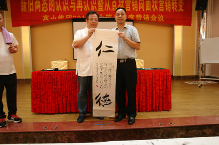 高山中藥、書法、茶道,一起傳承了中華民族文化。會(huì)議期間,品嘗高山養(yǎng)生茶,飲享中國養(yǎng)生茶文化,與彭教授、新聘請(qǐng)的高山技術(shù)老師顧問團(tuán)劉詩柱老師、葛君慧老師、李毅老師等行業(yè)專家互動(dòng)交流,還有,中國書法家協(xié)會(huì)會(huì)員、中國書畫名家協(xié)會(huì)理事、中南海紫光閣書畫院長、北京子書畫院院長吳子書書法家和茂名市神州書畫家協(xié)會(huì)副主席、信宜分會(huì)常務(wù)副主席兼秘書長、茂名市信宜文化藝術(shù)中心常務(wù)副主任彭奕海書法家 一起蒞臨會(huì)場(chǎng),題字“仁德”生輝!并以“民族的,世界的“題字勉勵(lì)高山的無抗養(yǎng)殖生命健康事業(yè),在2015年?duì)I銷業(yè)績同比增長大勢(shì)上,再創(chuàng)輝煌。