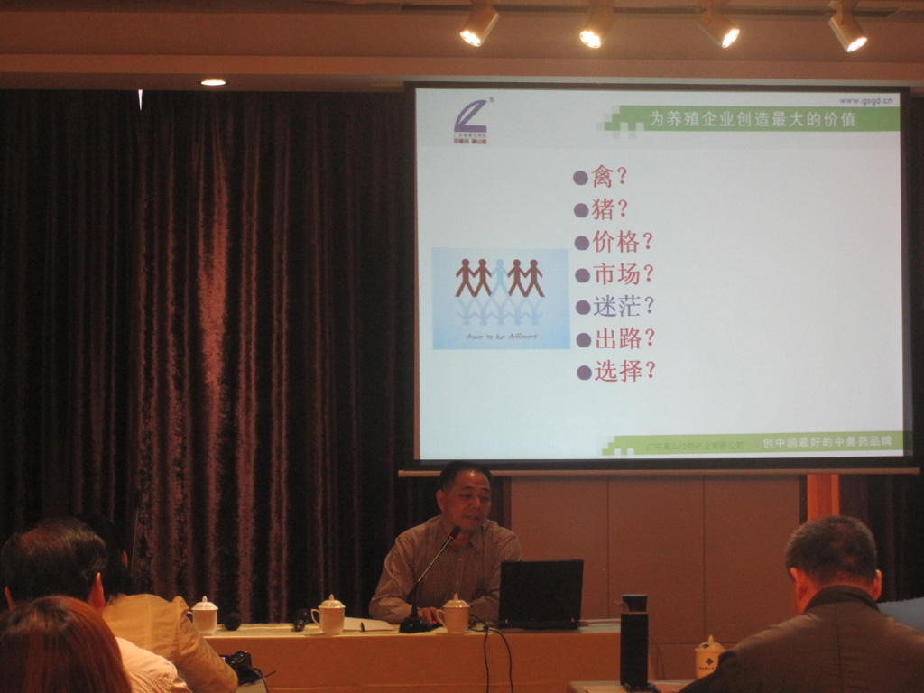 彭教授在會上展示了以甘草瘟毒康顆粒兌水噴霧治療豬牛無名高熱及瘟毒證示范,用“甘草瘟毒康顆粒+圓藍(lán)粵威龍”、“定喘散+圓藍(lán)粵威龍”和“泰山盤石散等產(chǎn)品做好種豬三保健”,以三套車喻行做好大家畜市場的營銷工作。
