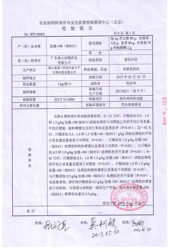 2、料磺1號(hào)和加曼100的試驗(yàn)由高山集團(tuán)委托國(guó)家農(nóng)業(yè)部飼料工業(yè)中心進(jìn)行。兩份試驗(yàn)報(bào)告是以在快大型肉用雞中分別使用料磺1號(hào)和加曼100,是完全取代飼料中所有的抗生素、促長(zhǎng)劑、球蟲(chóng)藥和脫霉劑等條件下的試驗(yàn)結(jié)果,其結(jié)果是無(wú)顯著差異,即說(shuō)明使用料磺1號(hào)或加曼100產(chǎn)品,與使用抗生素的效果相當(dāng),其替抗效果可行。