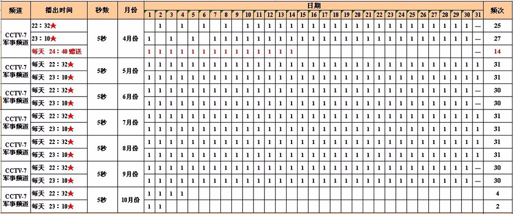 CCTV7料磺1號(hào)電視廣告播出排期表如下: