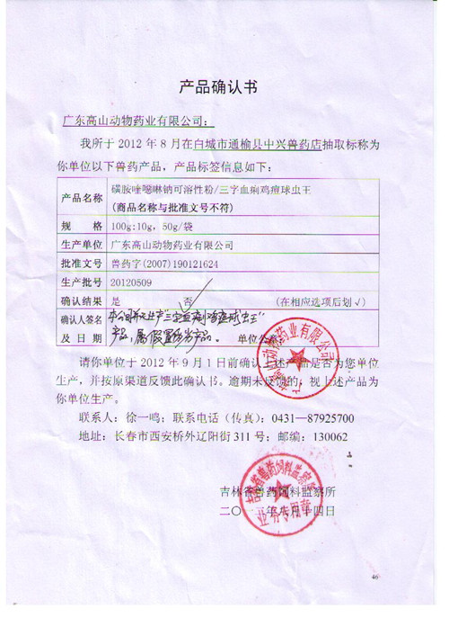 如近期在廣西省百色市被抽檢的“炎瘟一片救活(商品名)”、吉林省被抽檢的“三字血痢雞痘球蟲(chóng)王”并非公司生產(chǎn),該抽檢產(chǎn)品為假冒產(chǎn)品,現(xiàn)向廣大消費(fèi)者溫馨提示:廣東高山動(dòng)物藥業(yè)有限公司的產(chǎn)品擁有公司專有的、統(tǒng)一的、規(guī)范的包裝視覺(jué)系統(tǒng),以及產(chǎn)品代碼和防偽電話系統(tǒng),公司的業(yè)務(wù)人員均佩戴有公司的工作證和公司徽章。擁有公司合法的、完整的、正規(guī)的銷售渠道和網(wǎng)絡(luò),敬請(qǐng)廣大消費(fèi)者從公司直管的各省區(qū)渠道進(jìn)貨,并認(rèn)準(zhǔn)廣東高山動(dòng)物藥業(yè)有限公司的產(chǎn)品,謹(jǐn)防上當(dāng)受騙。廣東高山動(dòng)物藥業(yè)有限公司是高新技術(shù)企業(yè)、廣東省誠(chéng)信示范企業(yè)、同時(shí)擁有兩個(gè)廣東省著名商標(biāo),接受名牌商標(biāo)保護(hù)。假冒產(chǎn)品是嚴(yán)重違反獸藥管理?xiàng)l例和商標(biāo)保護(hù)相關(guān)法律法規(guī)的違法行為。公司保留對(duì)下述假冒產(chǎn)品銷售行為的進(jìn)一步追究權(quán)利。