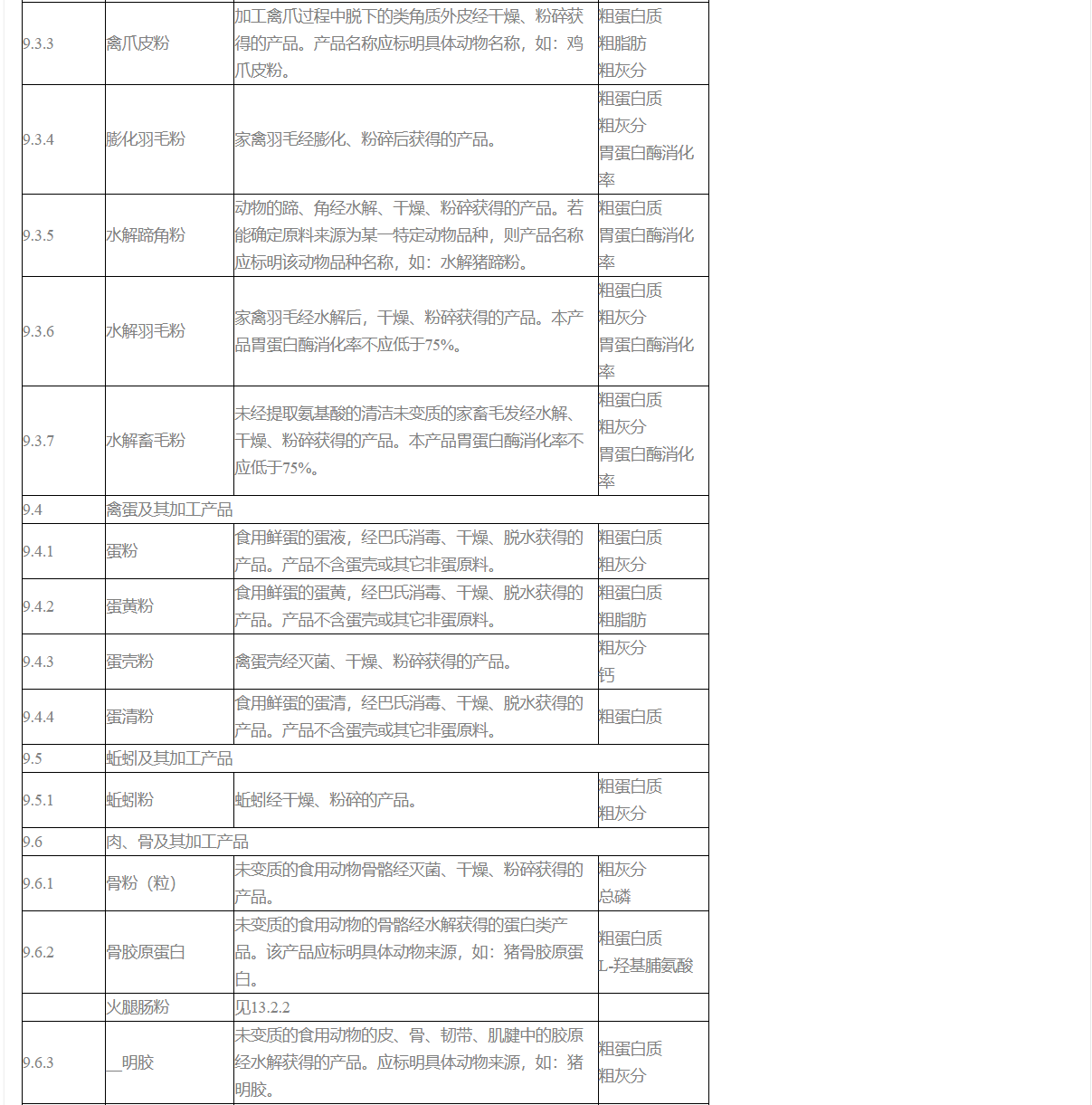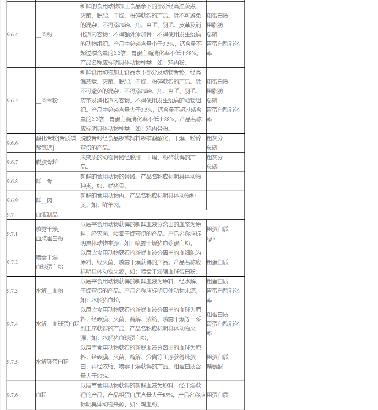 4. 肉粉、肉骨粉、骨粉(粒)、酸化骨粉、脫膠骨粉、明膠、骨膠原蛋白、動(dòng)物內(nèi)臟粉、禽爪皮粉、水解蹄角粉、腸膜蛋白粉、膨化羽毛粉、水解羽毛粉、水解畜毛粉、血粉、水解血粉、噴霧干燥血漿蛋白粉、噴霧干燥血球蛋白粉、水解血球蛋白粉、水解珠蛋白粉、血紅素蛋白粉、蛋粉、蛋黃粉、蛋清粉、蛋殼粉、動(dòng)物油脂、動(dòng)物油渣(粉)、