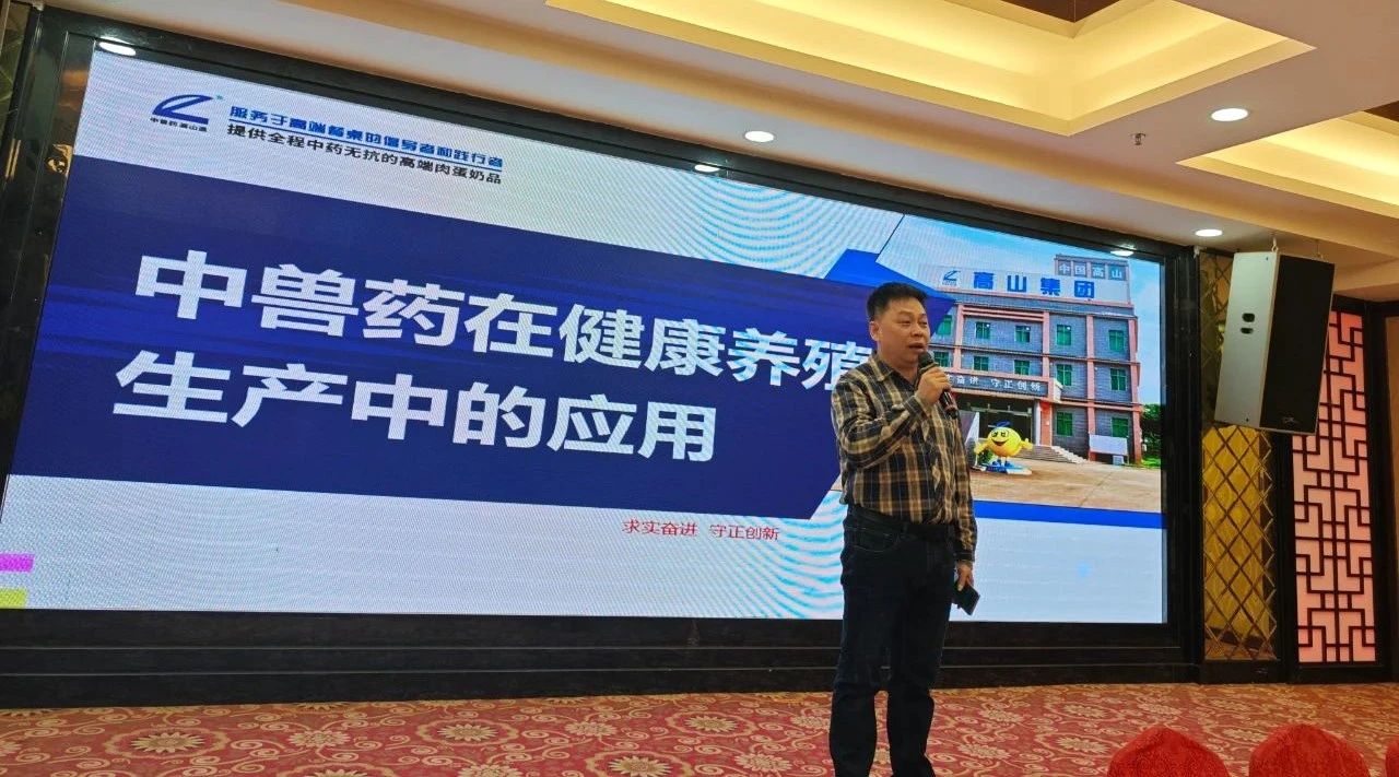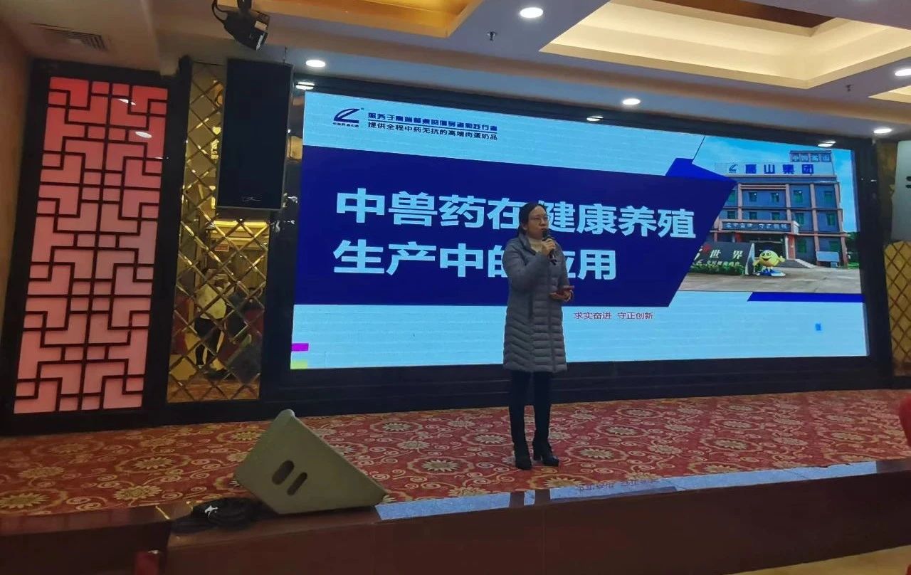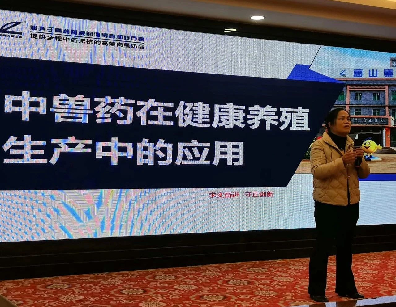高山集團(tuán)商學(xué)院培訓(xùn)師鐘飛燕作《中獸藥在健康養(yǎng)殖生產(chǎn)中的應(yīng)用》報(bào)告,首先指出全過(guò)程中藥無(wú)抗健康養(yǎng)殖方式,是保障畜禽產(chǎn)品更安全、更健康、更優(yōu)質(zhì)的重要途徑,是生產(chǎn)優(yōu)質(zhì)肉蛋奶品的更高形式。其次講解了健康養(yǎng)殖的關(guān)鍵是在生產(chǎn)中多使用中藥進(jìn)行預(yù)防保健,比如使用金方15、高山大巴溶液等做好開(kāi)口保?。缓粑绬?wèn)題使用強(qiáng)力粵威龍+侯炏凈、腸道問(wèn)題使用料磺1號(hào)+高山粵威龍散;定期使用正冠樂(lè)提高免疫力與抗病毒能力,使用免增粵威龍有助于解除免疫抑制、補(bǔ)氣血等。