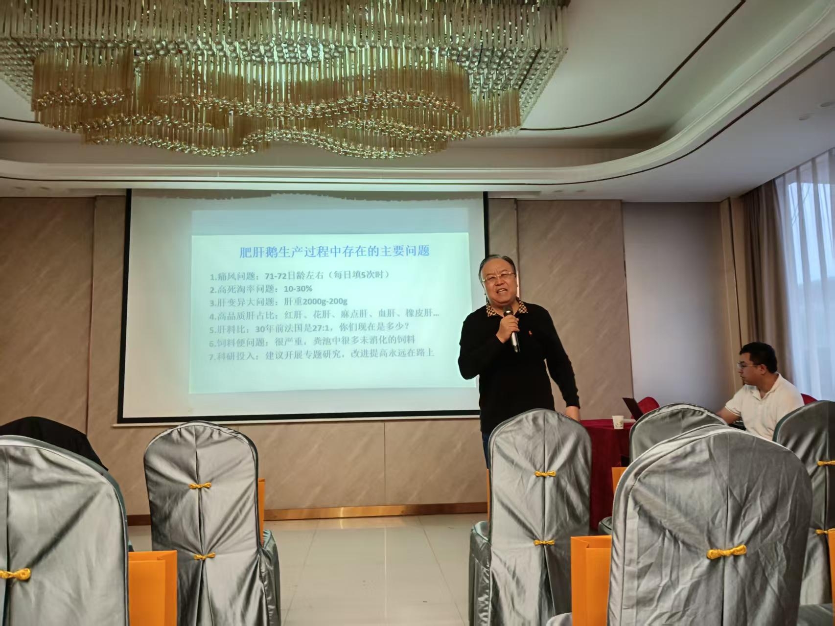 廣東省水禽產(chǎn)業(yè)技術體系崗位專家、廣東省農(nóng)村科技特派員、廣東海洋大學濱海農(nóng)業(yè)學院動物科學系賈汝敏教授作《肥肝鵝生產(chǎn)過程中的問題及形成原因探討》的報告,主要分享肥肝鵝生產(chǎn)過程中存在的主要問題、形成的原因以及中藥應對方案。并從水禽的多種常發(fā)病如呼腸孤、流感、黃病毒、副黏病毒病、小鵝瘟和痛風等的特點、主要癥狀和病理變化特征作了分析,指出養(yǎng)殖水禽病的防控是一項系統(tǒng)工程,要從“養(yǎng)、防、檢、治”做好防控,特別是要做好養(yǎng)殖日常管理以及使用中藥做好定期預防等。