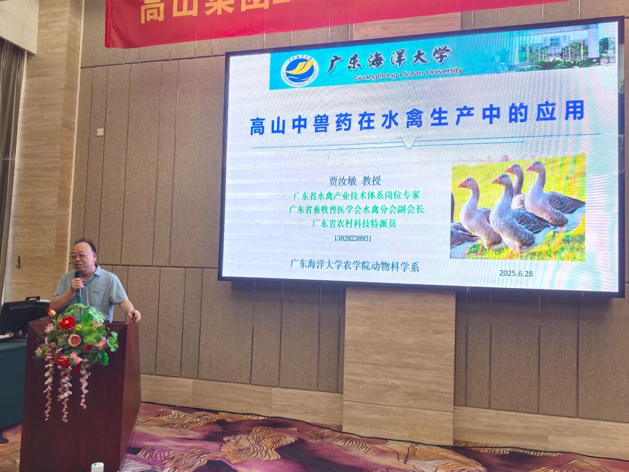 廣東省水禽產(chǎn)業(yè)技術體系崗位專家、廣東省農(nóng)村科技特派員、廣東海洋大學濱海農(nóng)業(yè)學院動物科學系賈汝敏教授作《高山中藥在水離生產(chǎn)中的應用》報告,首先講解當前水禽呈現(xiàn)多種病毒混感、病毒與細菌混感的流行特點,同時剖析水禽的常見疾病,同時指出,水禽近期病毒性疾病呈現(xiàn)出多發(fā)趨勢,并從呼腸孤病毒病、禽流感、副黏病毒病、安卡拉病和水禽痛風的發(fā)病特點和主要癥狀作了詳細的分析,并要從“養(yǎng)、防、檢、治”做好防控,特別是使用中藥做好定期預防,例如呼腸孤病毒病用加曼六康,禽流感用正冠樂、免增粵威龍和雙黃連散,副黏病毒病用正冠樂、黃芪多糖口服液和雙黃連口服液,安卡拉病用心型正冠樂和免增粵威龍散,水禽痛風用風道液和安黃舒等。最后分享暑熱應激下水禽養(yǎng)殖存在的問題及對策建議,可以從減少熱應激、飼料營養(yǎng)、水質、清除內毒素、合理光照和提高孵化率的措施等改善夏季種鵝繁殖性能,特別是使用中藥預防,暑熱應激用藿香正氣口服液、增強免疫用免增粵威龍散、腸道健康用白頭翁散和溫白三、排毒解毒用料磺1號、抗病毒用正冠樂、雙黃連口服液和黃芪多糖口服液等。