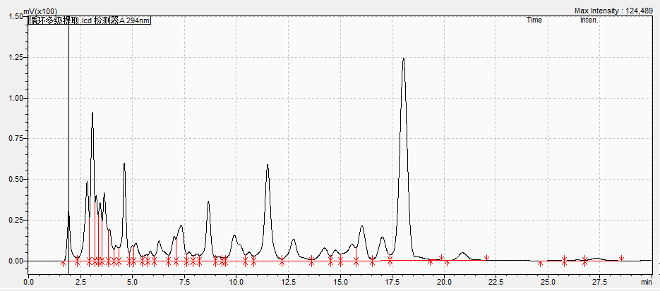 藿香正氣口服液依據(jù)《中國(guó)獸藥典》2015年版二部生產(chǎn),配方中含有厚樸,在其建議生產(chǎn)工藝中厚樸的提取方法是采用60%乙醇加熱回流1小時(shí)。經(jīng)研究總結(jié),廣東高山技術(shù)創(chuàng)新中心對(duì)厚樸提取工藝采取多級(jí)循環(huán)蒸餾提取,以及醇和水提結(jié)合,能充分將其有效成分和有用成份提取出來,所得的有效成分比原標(biāo)準(zhǔn)工藝多,而且有效成分含量高(見附圖1、附圖2液相色譜圖),有用成份膏體更多,產(chǎn)品的臨床效果比原生產(chǎn)工藝更好?!暗赖兀ㄋ幉漠a(chǎn)地)+鮮?。ㄞ较悖?厚樸提取工藝改進(jìn)”,致其所制得的藿香正氣口服液的效果也更好更獨(dú)特。