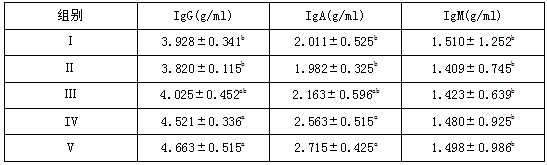 由表5可知,25d時(shí),Ⅰ、Ⅱ、Ⅲ、IV、V五組間的母仔雞血清中IgM差異均不顯著(P>0.05);Ⅰ、Ⅱ、Ⅲ組中母仔雞血清IgG、IgA之間差異不顯著(P>0.05);IV、V組中母仔雞血清IgG、IgA與Ⅰ、Ⅱ組之間有顯著差異(P<0.05)。