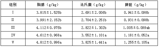 由表3可知,25d時(shí),Ⅰ、Ⅱ、Ⅲ組之間胸腺指數(shù)、法氏囊指數(shù)、脾臟指數(shù)均差異不顯著(P>0.05);IV、V組胸腺指數(shù)、法氏囊指數(shù)均顯著高于Ⅰ、Ⅱ、Ⅲ組(P<0.05);IV、V組脾臟指數(shù)均顯著高于Ⅰ、Ⅱ組(P<0.05)。