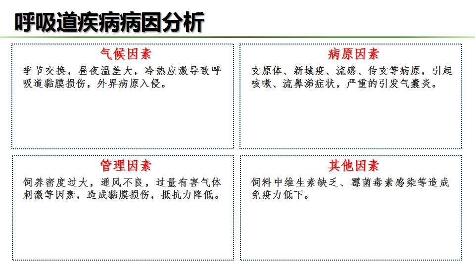 在生產(chǎn)中,呼吸道綜合證往往是一種或多種呼吸道疾病的混合,容易反復(fù),主要是呼吸道上面分布的血管很少,一般藥物很難到達(dá)這個(gè)部位,患病后不好處理。用中醫(yī)的理論指導(dǎo),用中藥應(yīng)對(duì)呼吸道綜合證。