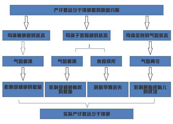 若子宮氣血瘀滯,如子宮炎,使精子在5個(gè)小時(shí)內(nèi)(有資料顯示,精子在子宮內(nèi)存活不會(huì)超過(guò)5個(gè)小時(shí),如果5個(gè)小時(shí)之內(nèi)未離開(kāi)子宮,精子將不再存活)到達(dá)受精部位的數(shù)量減少,致受精卵減少,產(chǎn)仔數(shù)降低。若卵子與精子能夠成功結(jié)合,但受精卵還要在子宮內(nèi)著床,此時(shí)子宮氣血瘀滯的狀態(tài)影響受精卵返回子宮后的著床,受精卵著床數(shù)減少,產(chǎn)仔數(shù)降低。此時(shí)需補(bǔ)氣活血,消腫安胎。
