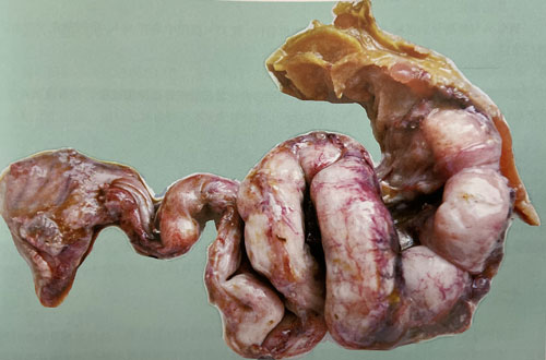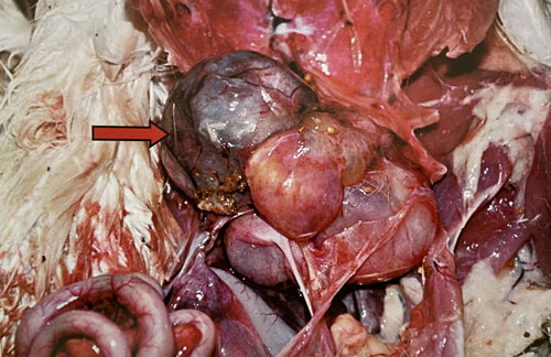 剖檢可見輸卵管充血、腫脹,嚴(yán)重的呈深紅色或暗紅色,局部高度擴(kuò)張,管壁變薄,內(nèi)有黃、白色膿樣分必物,黏膜有出血點(diǎn);卵泡數(shù)目減少,卵泡變形,卵巢變形,卵巢萎縮,腸系發(fā)生炎癥,致使腸與腸以及其他臟器相互粘連。