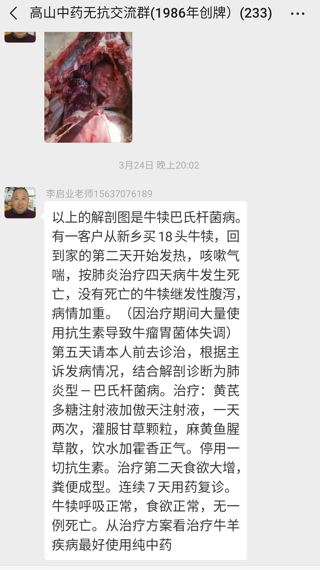 案例:有一客戶從新鄉(xiāng)買18頭牛犢,回到家的第二天開始發(fā)熱,咳嗽氣喘,按肺炎治療四天病牛發(fā)生死亡,沒有死亡的牛犢繼發(fā)性腹瀉,病情加重。(因治療期間大量使用抗生素導致牛瘤胃菌體失調)第五天請本人前去診治,根據(jù)主訴發(fā)病情況,結合解剖診斷為肺炎型―巴氏桿菌病。治療:黃芪多糖注射液加傲天注射液,一天兩次,灌服甘草顆粒,麻黃魚腥草散,飲水加藿香正氣口服液。停用一切抗生素。治療第二天食欲大增,糞便成型。連續(xù)7天用藥復診。牛犢呼吸正常,食欲正常,無一例死亡。從治療方案看治療牛羊疾病是使用純中藥。