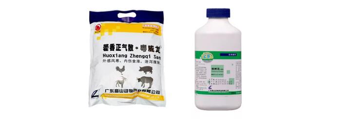 經(jīng)典套餐1:藿香正氣散2g/斤料+楊樹花口服液2ml/斤料,每月用3-5天。