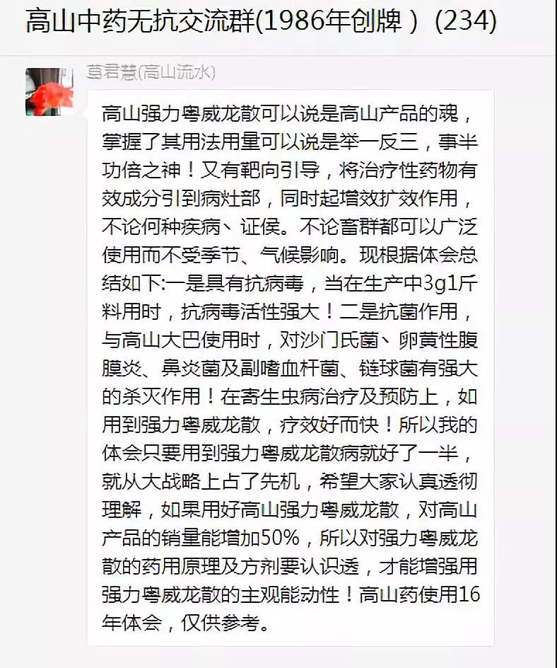 葛老師說:高山強(qiáng)力粵威龍散可以說是高山產(chǎn)品的魂,掌握了其用法用量可以說是舉一反三,收事半功倍之神效!又有靶向引導(dǎo)作用,將治療性藥物有效成分引到病灶部,同時(shí)起增效擴(kuò)效作用,不論何種疾病、證侯。不論畜禽都可以廣泛使用而不受季節(jié)、氣候影響。現(xiàn)根據(jù)體會(huì)總結(jié)如下:一是具有抗病毒作用,當(dāng)在生產(chǎn)中3g1斤料用時(shí),抗病毒活性強(qiáng)大!二是抗菌作用,與高山大巴使用時(shí),對(duì)沙門氏菌、卵黃性腹膜炎、鼻炎菌及副嗜血桿菌、鏈球菌有強(qiáng)大的殺滅作用!在寄生蟲病治療及預(yù)防上,如用到強(qiáng)力粵威龍散,療效好而快!所以葛老師的體會(huì)是只要用到強(qiáng)力粵威龍散病就好了一半,就從大戰(zhàn)略上占了先機(jī),希望大家認(rèn)真透徹理解,如果用好高山強(qiáng)力粵威龍散,對(duì)高山產(chǎn)品的銷量能增加50%,所以對(duì)強(qiáng)力粵威龍散的藥用原理及方劑要認(rèn)識(shí)透,才能增強(qiáng)用強(qiáng)力粵威龍散的主觀能動(dòng)性!高山藥使用16年體會(huì),僅供參考。